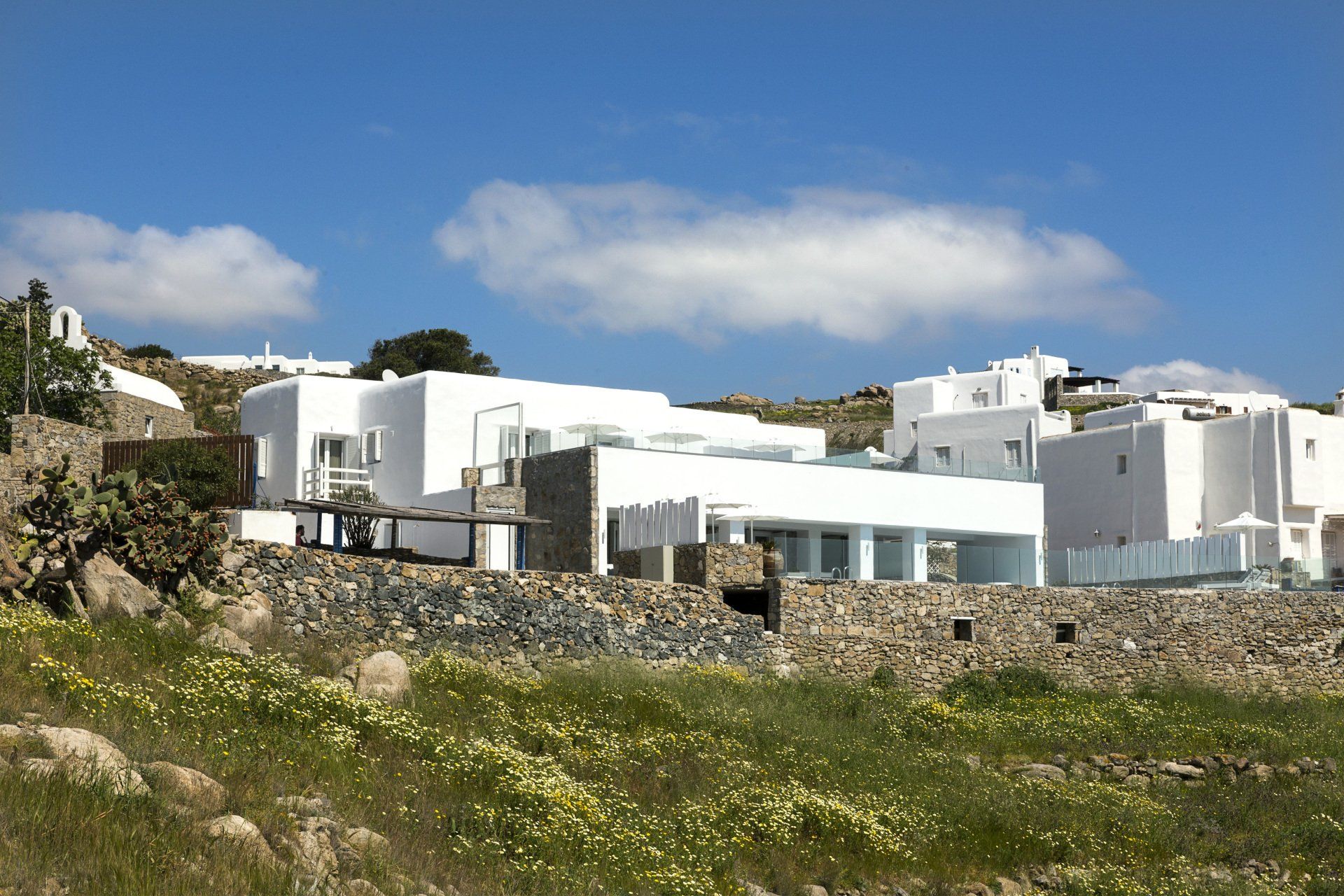 L'Amperian si trova sulla cima della collina della baia di Ornos, una delle località più famose e convenienti di Mykonos e offre viste mozzafiato sulla spiaggia di Ornos, sul Mar Egeo e sull'isola di Paros in lontananza.