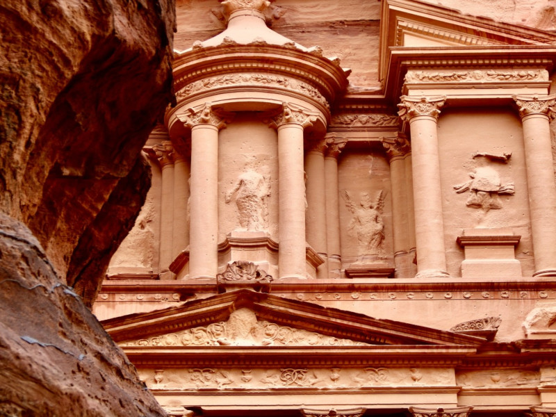 Passeggiata attraverso il Siq, uno stretto e ventoso sentiero tra le rocce, per raggiungere il Tesoro, il teatro romano, il Palazzo della figlia del faraone, il Tempio del Leone Alato e tanti altri monumenti.