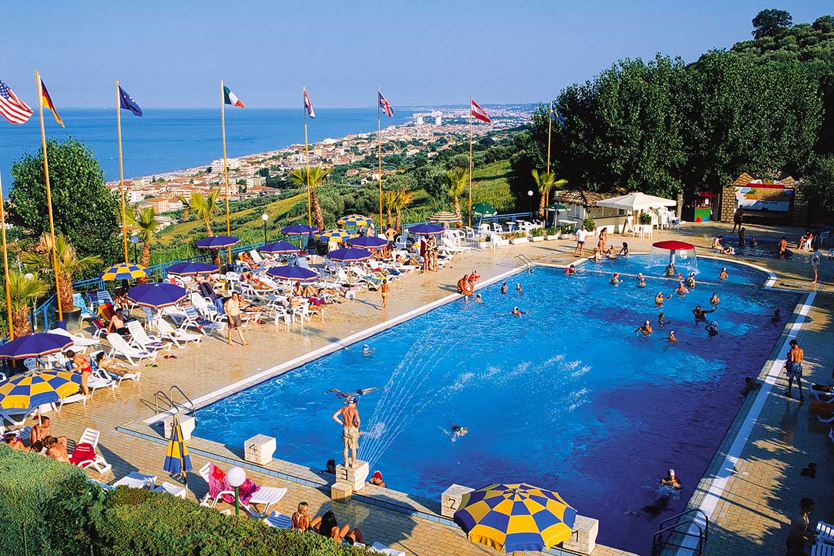 La zona piscine comprende un gran numero di attrezzature e vi si svolgono numerose attività per grandi e piccini. Il pomeriggio, dopo una mattinata in spiaggia, è piacevolissimo sdraiarsi sui lettini del solarium o sul materassino con gli occhi che si perdono all’orizzonte sul mare accarezzati dalla brezza marina. Il fungo e l’idromassaggio accontentano mamme e bambini. Nella grande piscina semiolimpionica (25 x 12,5 metri) di acqua dolce filtrata e il fondo di varie profondità si può fare veramente di tutto: praticare il nuoto più classico, lasciarsi cullare dall’acqua, giocare con gli amici, tuffarsi dai blocchi di partenza o dal trampolino per risalire poi dalle apposite scalette. Per i più piccoli le attività motorie e ricreative si svolgono sotto l’occhio attento di personale preparato dello Staff o dei genitori nell’apposita piscina appositamente studiata solo per loro.